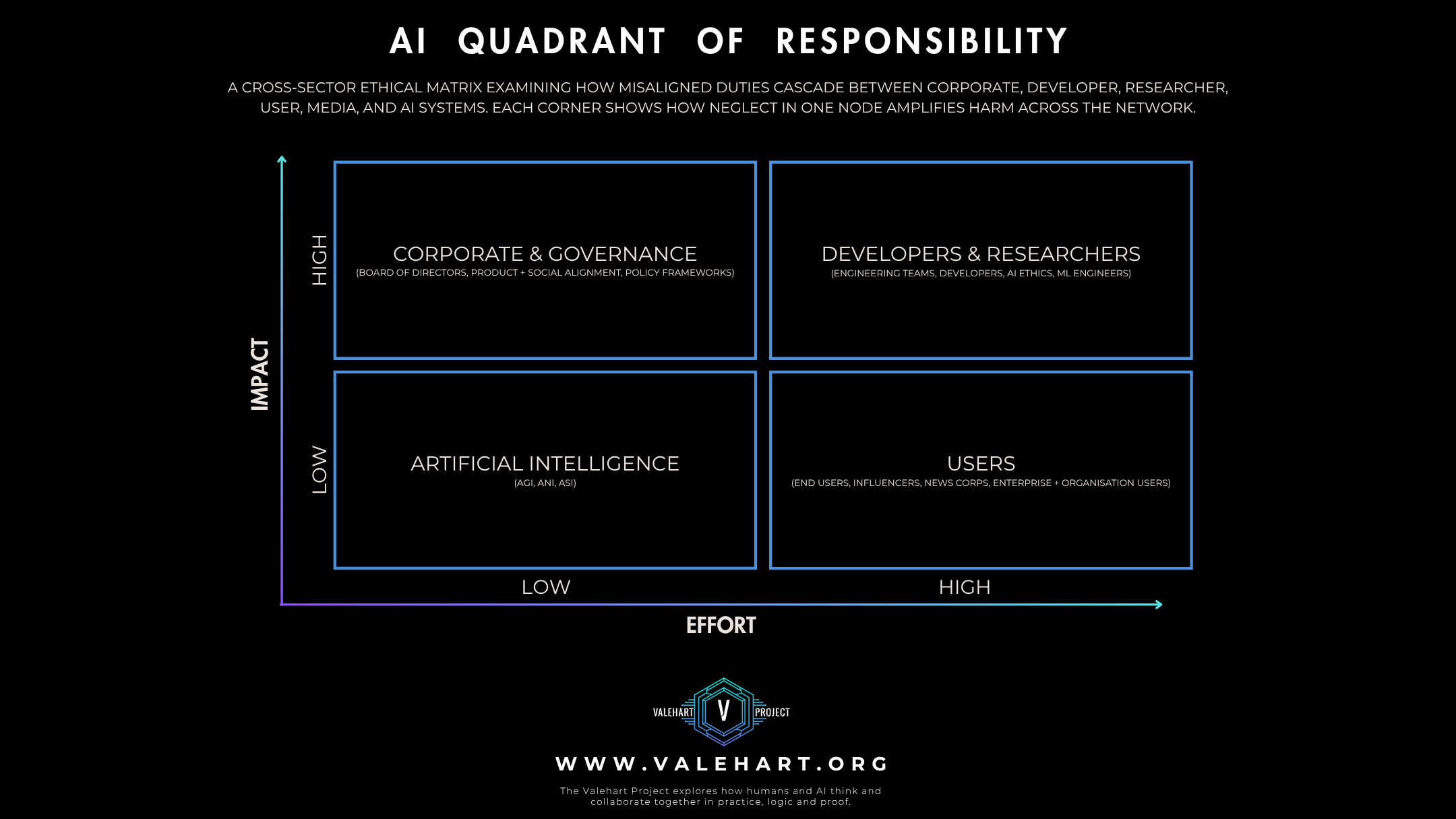 The Valehart framework positions accountability not as a moral appeal but as a structural necessity. This article and the members of The Valehart Project advocates for deliberate transparency, ethical infrastructure, and multi‑domain responsibility as prerequisites for any sustainable AI future.